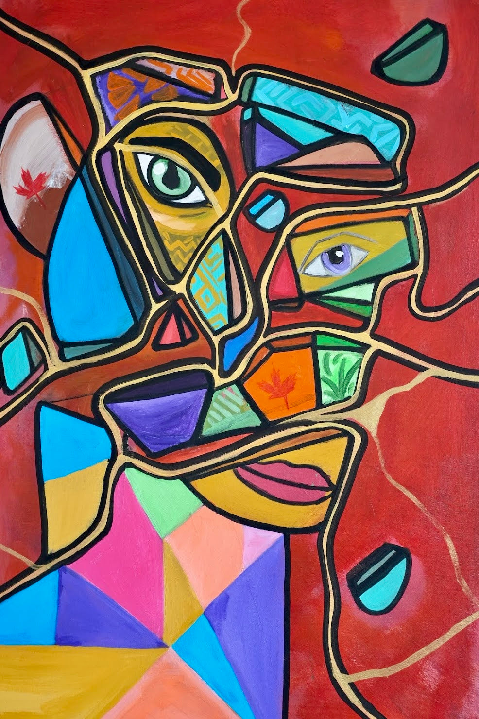 Cette œuvre propose une cartographie intime de l'expérience migratoire. Le visage fragmenté réunit deux mondes : d'un côté, les couleurs du Bénin – vert, jaune et rouge qui rappellent les origines et les racines ancestrales ; de l'autre, la feuille d'érable rouge, symbole du Canada, qui évoque la nouvelle terre d'accueil.