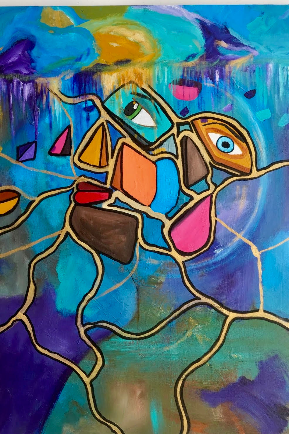 Cette œuvre dévoile l'identité dans une dimension cosmique. Les fragments colorés deviennent des étoiles dispersées, reliées par des lignes dorées qui tracent des constellations personnelles. Ici, l'individu est à la fois fracturé et unifié, inscrit dans une cartographie céleste où chaque fragment d'expérience brille comme une étoile. L'identité se lit comme une galaxie intérieure, en expansion permanente.