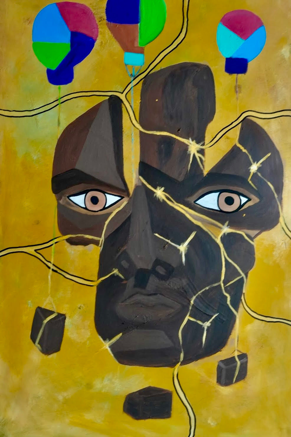 Cette œuvre présente l'identité comme une empreinte ancienne, figée dans le temps. Le visage fragmenté, traversé par des lignes dorées, évoque un fossile : une trace vivante d'expériences accumulées, marquée dans la matière. Au-dessus d'eux, des montgolfières colorées ouvrent une échappatoire : un rappel que même ce qui est figé dans les strates du passé peut donner lieu à un élan, un mouvement et une élévation